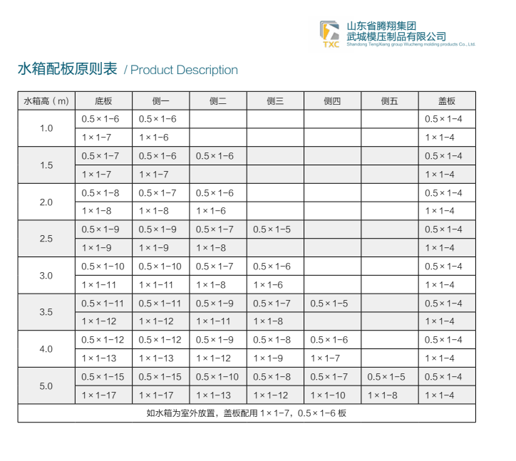 水箱配板原則表都有一個大概的行業標準,大部份的廠家會遵循這個標準來制作消防水箱,以下是山東騰翔集團的水箱配板原則表: