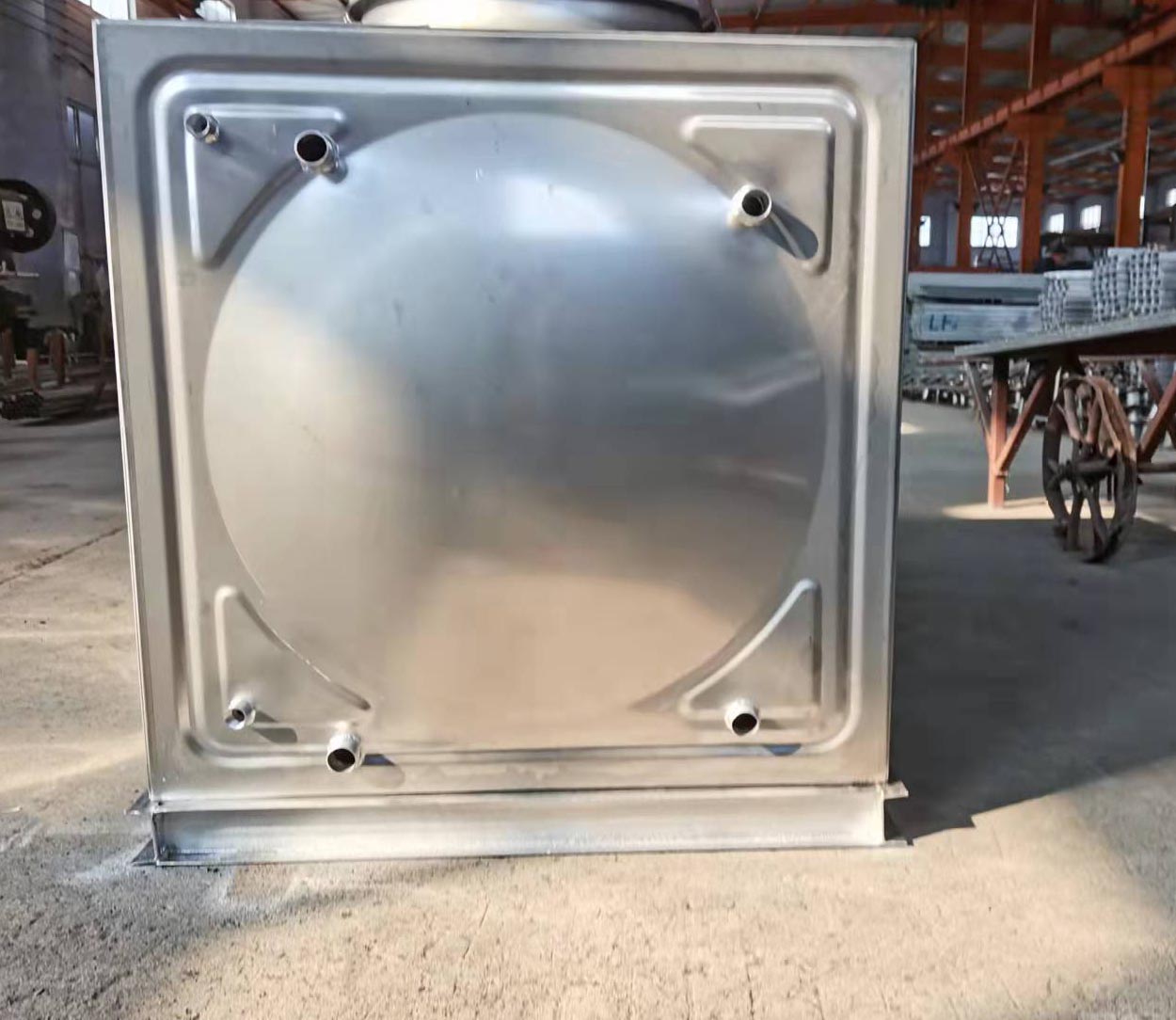 水箱基礎可采用混凝土條形梁,或工字鋼。水箱頂部對角設有透氣空氣過濾裝置。水箱內部均使用拉筋。各管口法蘭均為1.0MPa標準法蘭。